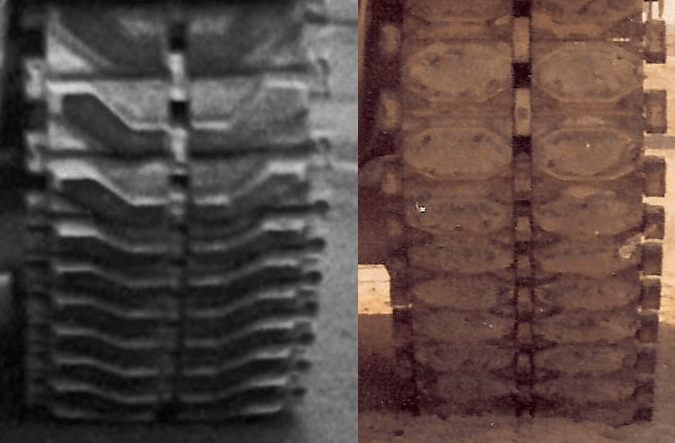 This is the Israeli designation for the M60A1 tank. The Magach 6A’s identification is simple, aside from confirming it has the elongated M60A1 style turret, confirm that it has the T97 tracks and not the T142 tracks such as those found on the Magach 6B. The T142 has octagonal rubber pads, vastly different from the T97 tracks. The photo on the left is that of a T97 track, while the photo on the right is T142.