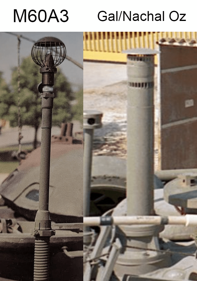 The identification of this vehicle is fairly simple, as it is the only one to use the M68E1 105 mm gun and its distinctive American thermal sleeve. There are differences from other variants that may look similar (like Magach 6B) like the rangefinder. Unlike previous M60 variants, the M60A3 came out of American factories with a laser range finder instead of the traditional coincidence rangefinder. However, the difference is only noticeable on the left side of the vehicle. The newer rangefinder has a hinged cover, and the gunner sight is also an American dual-channel sight. While similar externally to that found on Nachal Oz FCS, the American thermal sleeve is a clear giveaway that this is not a Magach 6M. Additionally, the Magach 6 Gimel retained the American style of crosswind sensor, which looks different from those found on Israeli FCSs such as Gal or Nachal Oz.